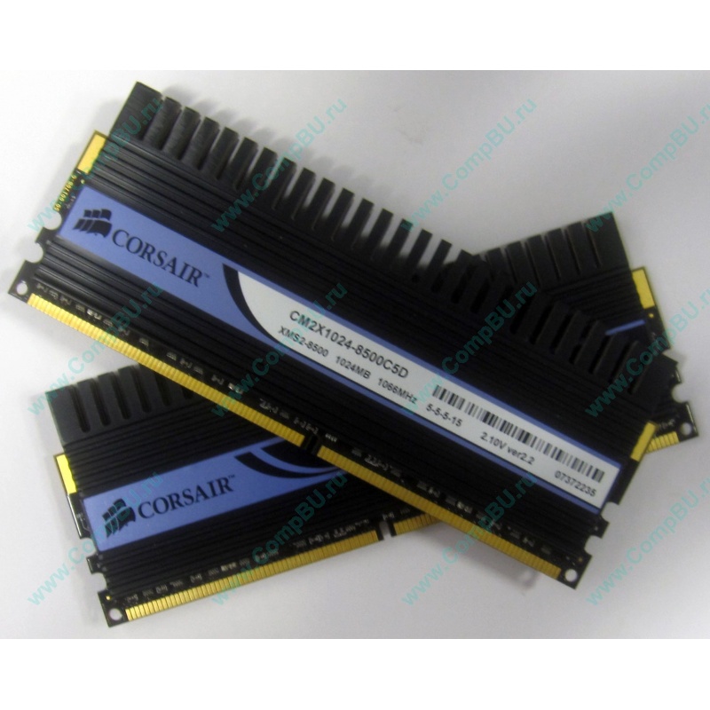Два модуля памяти 1024Mb DDR2 Corsair Dominator CM2X1024-8500C5D XMS2-8500 pc-8500 (1066MHz) с чёрным радиатором. Напряжение 2.10V. Продаются парой, цена указана за комплект из двух модулей. По отдельности не продаются!