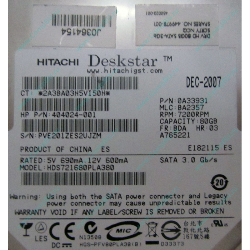 Б/У жёсткий диск 80Gb Hitachi Deskstar HDS721680PLA380 (80 гигабайт, 7200 rpm) SATA (HP part no. 404024-001, spare no. 449978-001). Можно устанавливать не только в компьютеры HP.